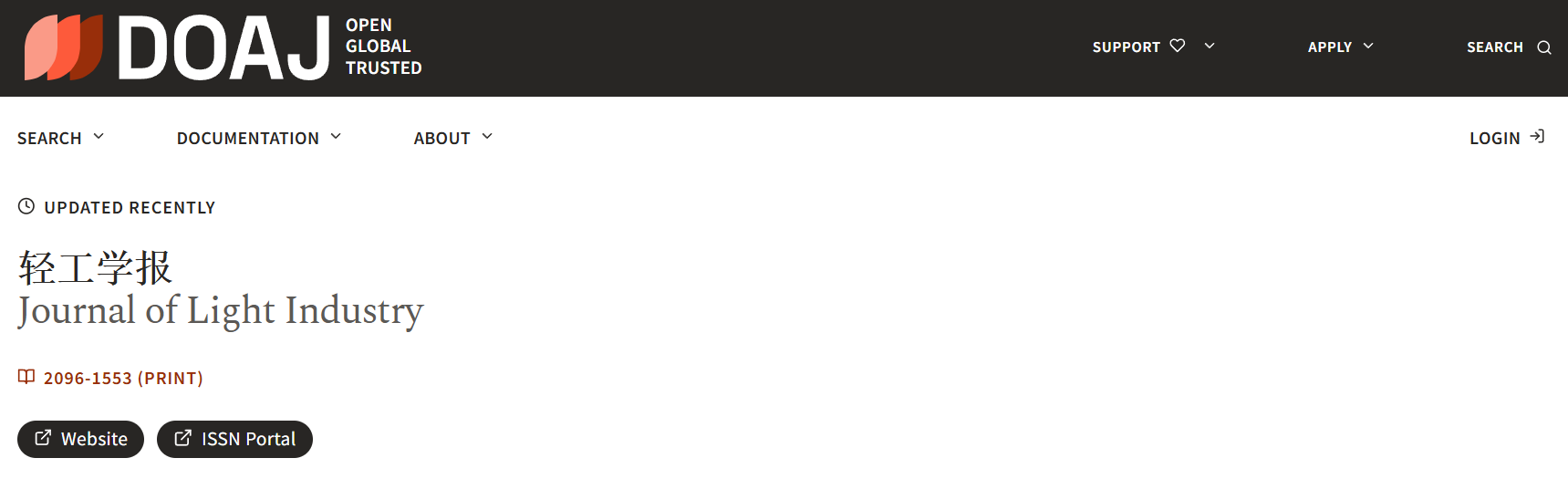 近日,《轻工学报》经过严格评审,正式被全球最具影响力的开放存取期刊目录DOAJ(Directory of Open Access Journal)收录。这标志着本刊在学术质量、数字出版与开放获取政策等方面均已获得国际权威认可,对提升期刊国际影响力、拓展学术传播范围、加强质量建设具有重要意义。